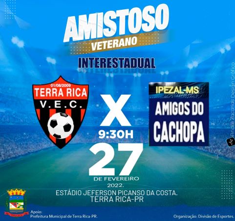 No dia 27 de fevereiro, a equipe Terra Rica Veterano EC receberá para amistoso interestadual de futebol a equipe Amigos do Cachopa, de Ipezal/MS.