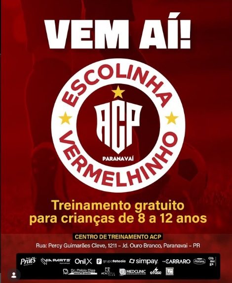 Hoje e amanhã, 15, no Centro de Treinamento do Atlético Clube Paranavaí estão abertas gratuitamente as inscrições para a Escolinha de Futebol do Vermelhinho, para atletas de 8 a 12 anos.