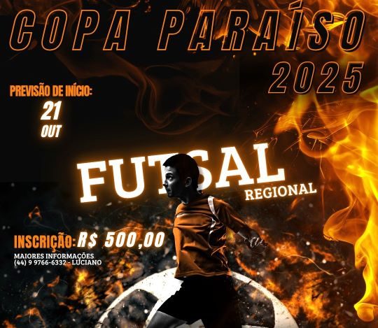 Com início previsto para o dia 21 de outubro, as inscrições para a Copa Paraíso de Futsal Regional em Paraíso do Norte estáo a disposição das equipes, a premiação total será de 12 mil reais.