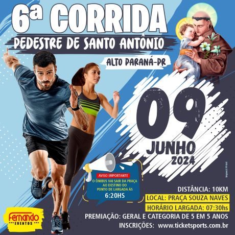 Será neste domingo, 9 de junho, em Alto Paraná a sexta edição da Corrida Pedestre de Santo Antônio com percurso de 10 km.