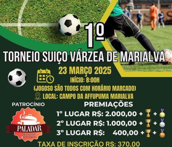 No dia 23 de março em Marialva, será disputado o 1º Torneio de Futebol Suíço Várzea com premiação total de R$ 5.400 e troféu.