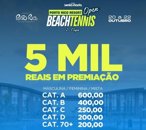 De 20 a 22 de outubro haverá no Porto Rico Resort, a segunda etapa do Open de Beach Tennis com premiação em dinheiro e troféu.